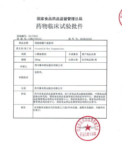 2018年3月20日,我公司收到国家食品药品监督管理总局颁发的《药物临床试验批件》(批件号:2018L02182)。根据《中华人民共和国药品管理法》及有关规定,经国家食品药品监督管理总局审查,公司申报的利他唑酮干混悬剂符合药品注册的有关要求,同意我公司开展该药品的临床试验。
